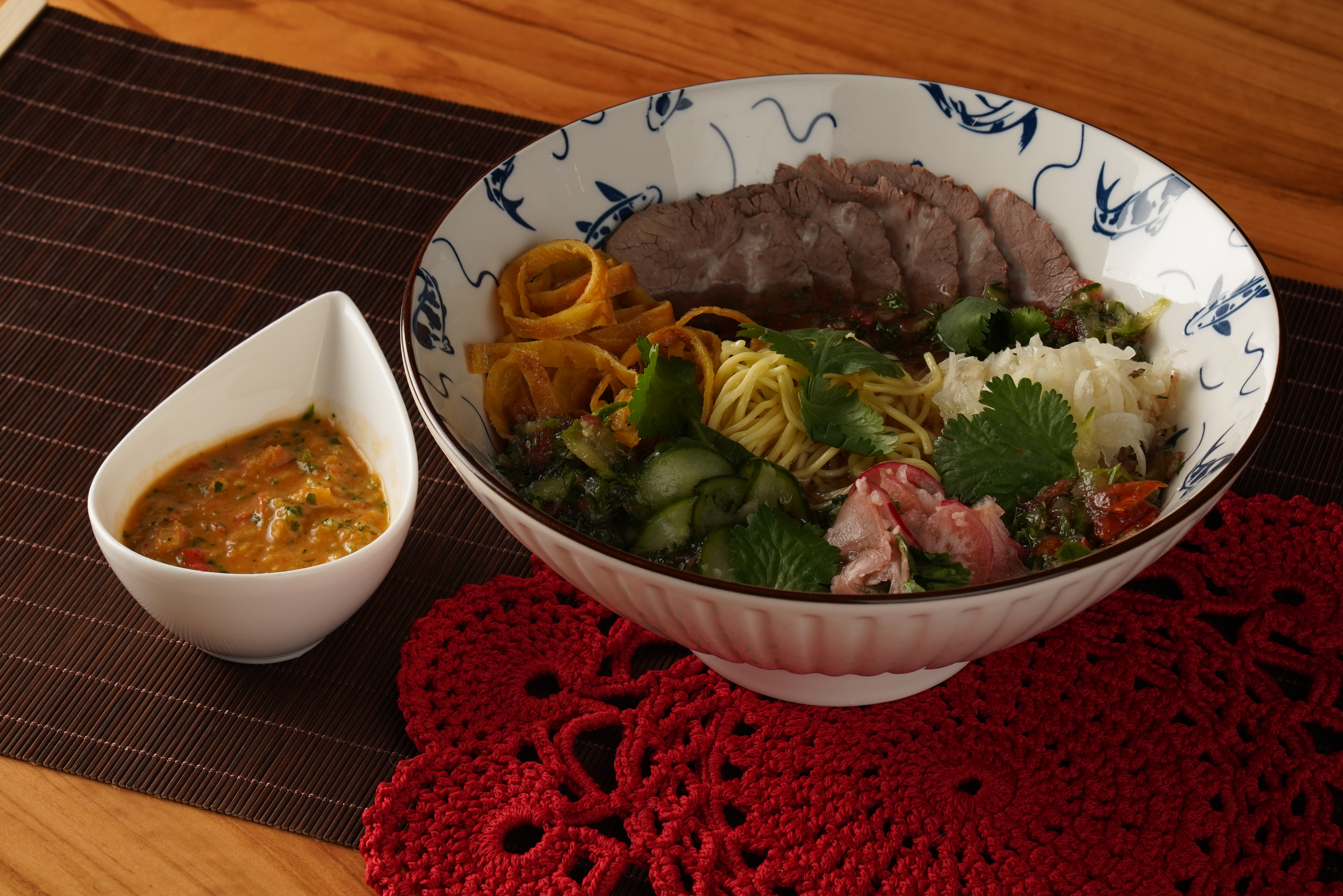 Холодный суп .Основа- рассол из помидора ,огурца,укропа,соевого соуса ,уксуса.Говядина терияки либо обжаренный сибас,кинза,капуста,огурец,редиска,омлет,лапша удон.