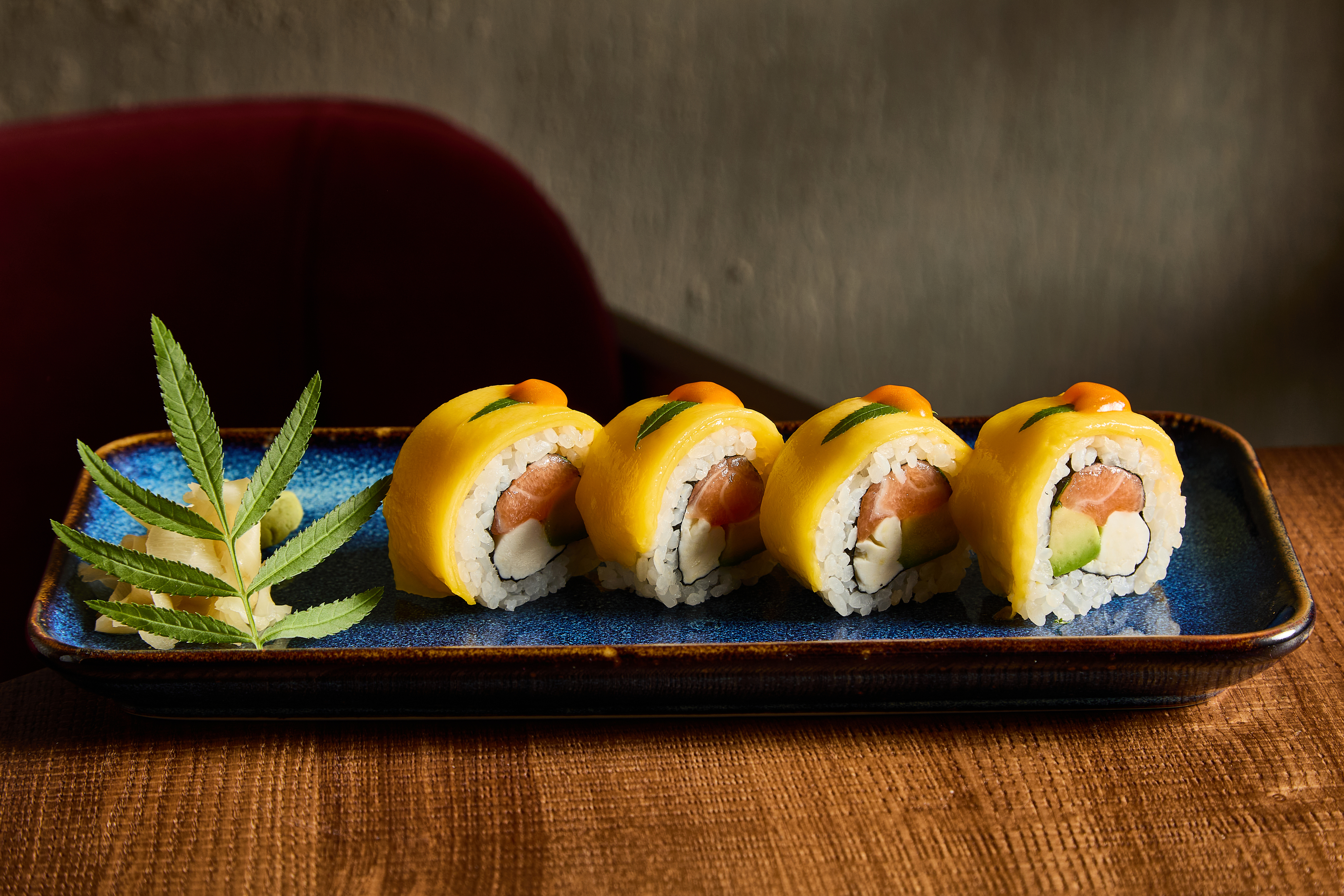 В составе манго, авокадо, копченый лосось, сыр, базилик, рис, нори, имбирь, васаби ( в порции 4 шт)