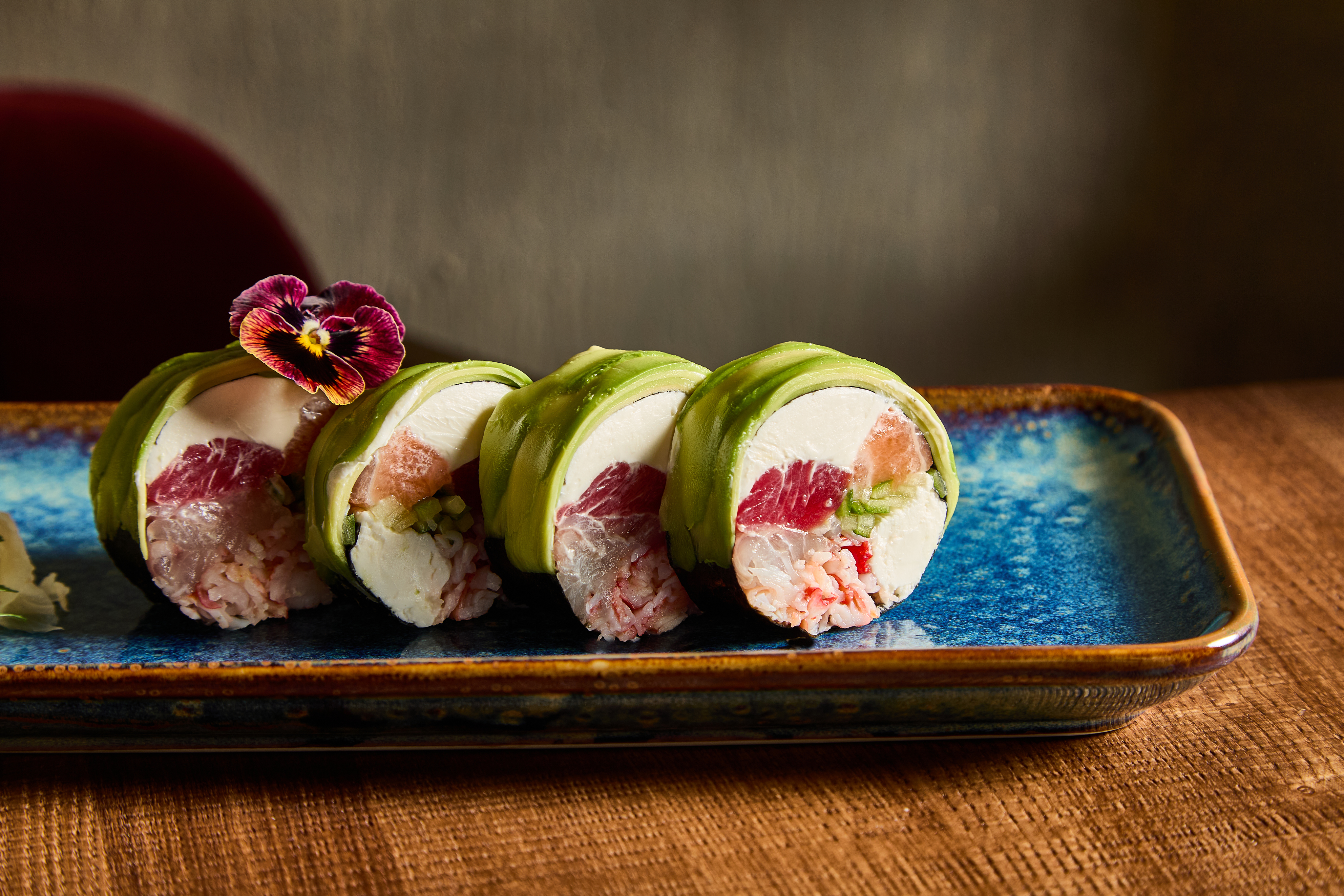 В составе: авокадо, краб, тунец, сибас, сыр, огурец, рис, нори, омлет,имбирь, васаби ( в порции 4 шт)