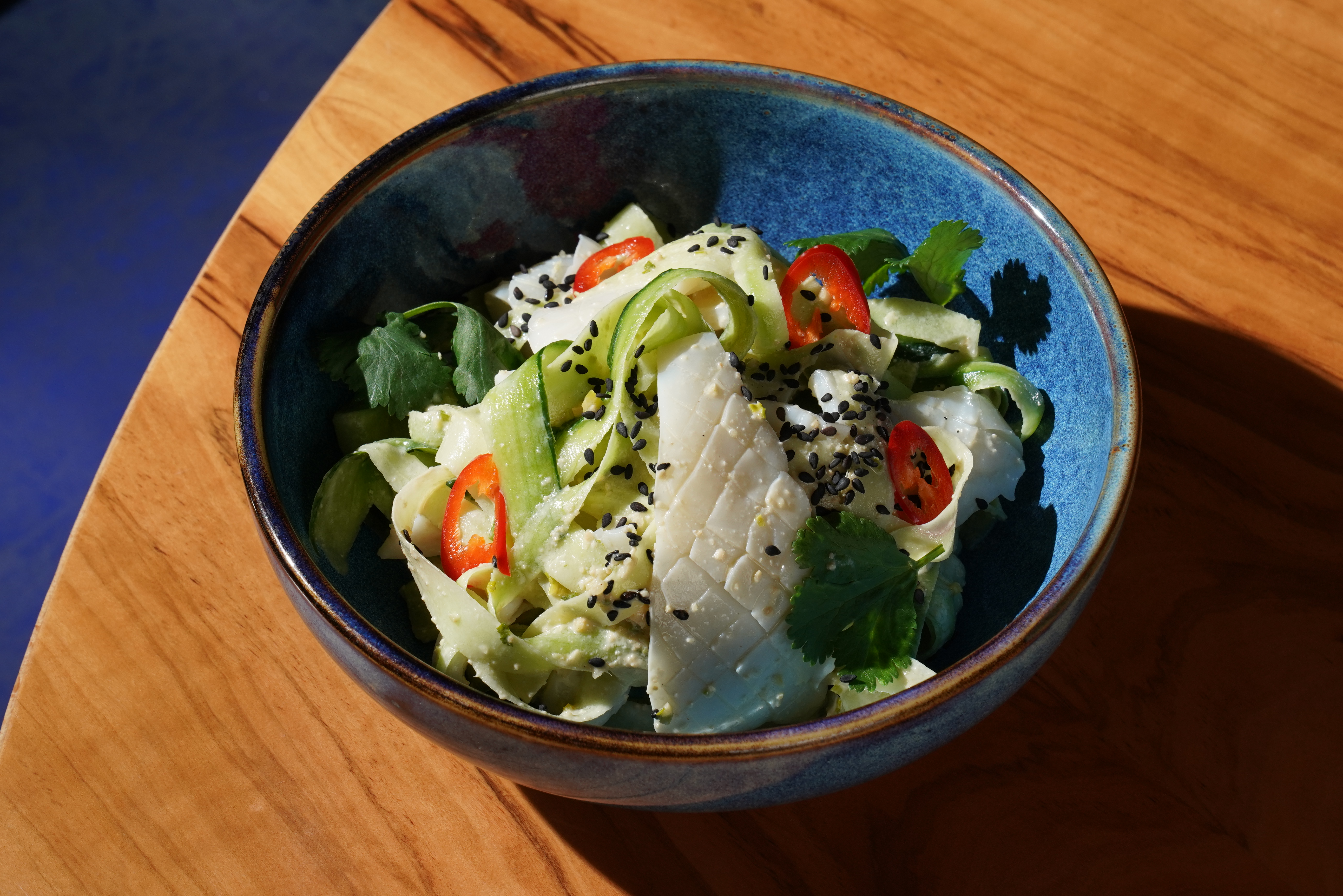Кальмар,огурец слайсом,кинза,кунжут,соус кунжутно-ореховый(кинза,чеснок,имбирь,лимон,соевый соус,ореховый).